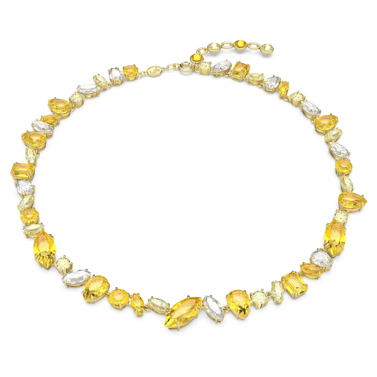Showcasing the vivacious spirit of the Gema family, this vibrant necklace combines crystals in a variety of extraordinary cuts that work beautifully together as one. The gold-tone plated design features clear and yellow crystals in a unique design for a truly individual look. Wear this necklace to instantly ignite your style.