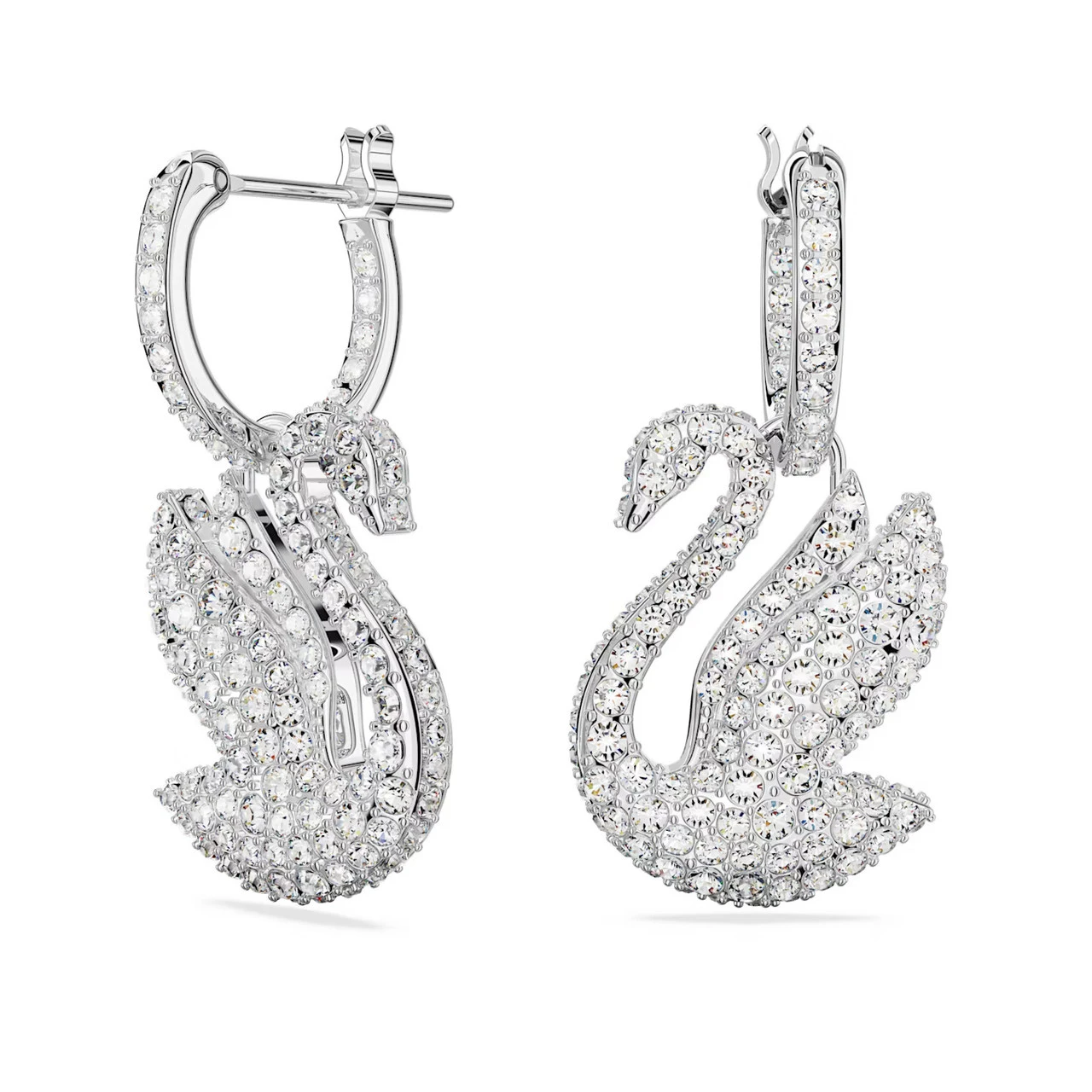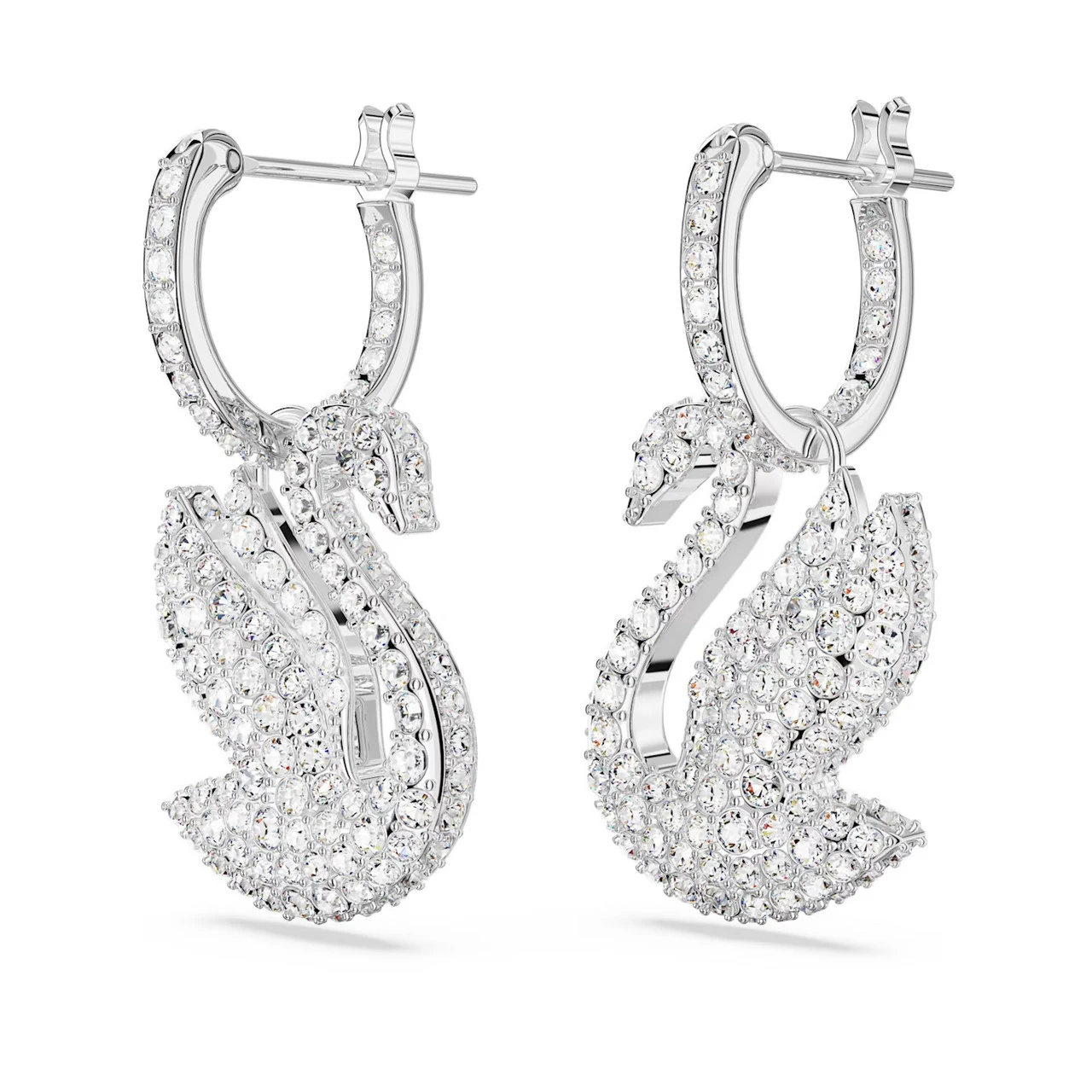 These radiant earrings are the perfect representation of the iconic Swarovski Swan in motion. To create the shimmering silhouette, each piece features all-over pavé in white crystals set on high-shine rhodium plating. Wear them as a daily reminder to spread your wings.