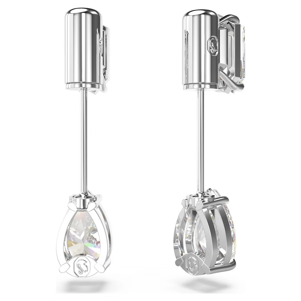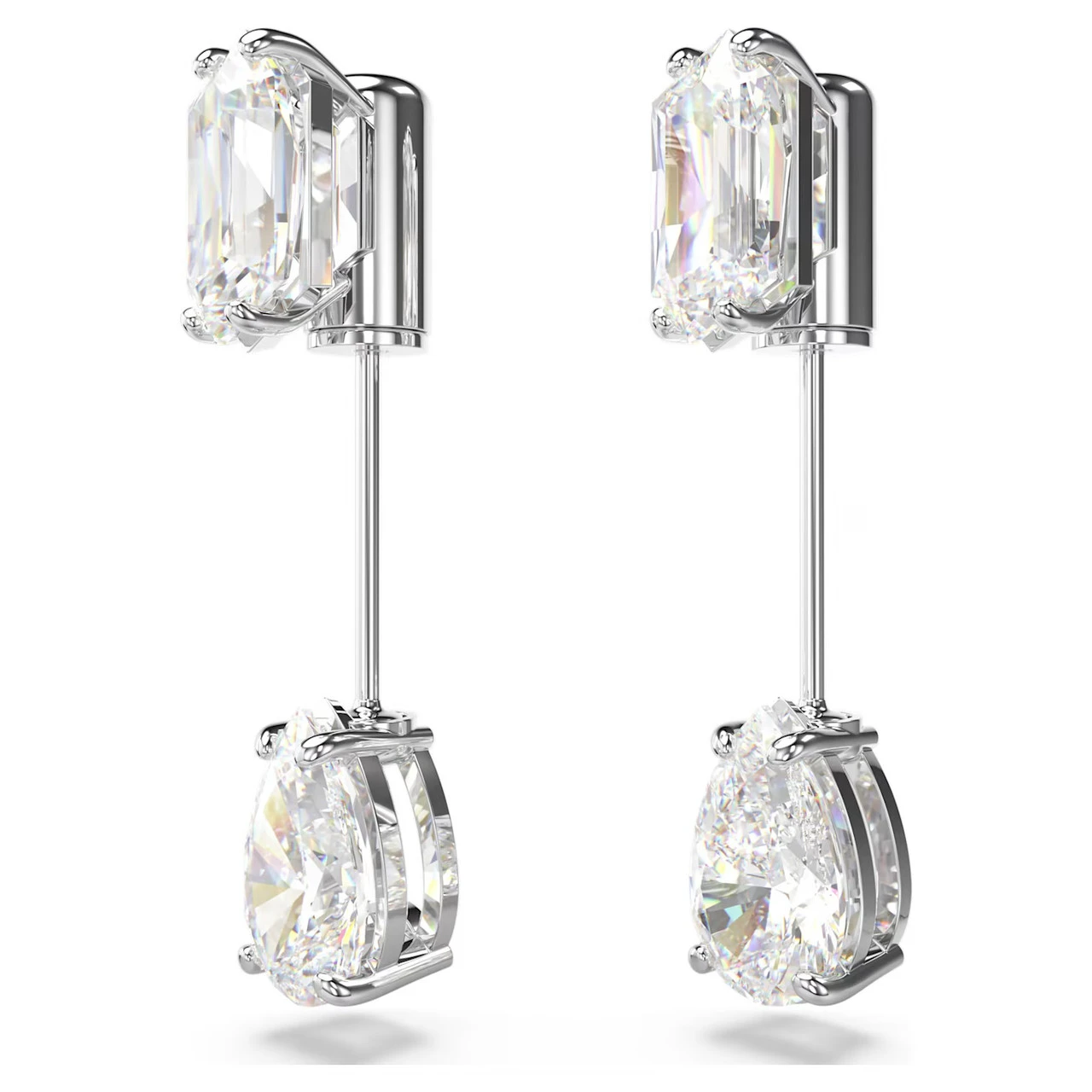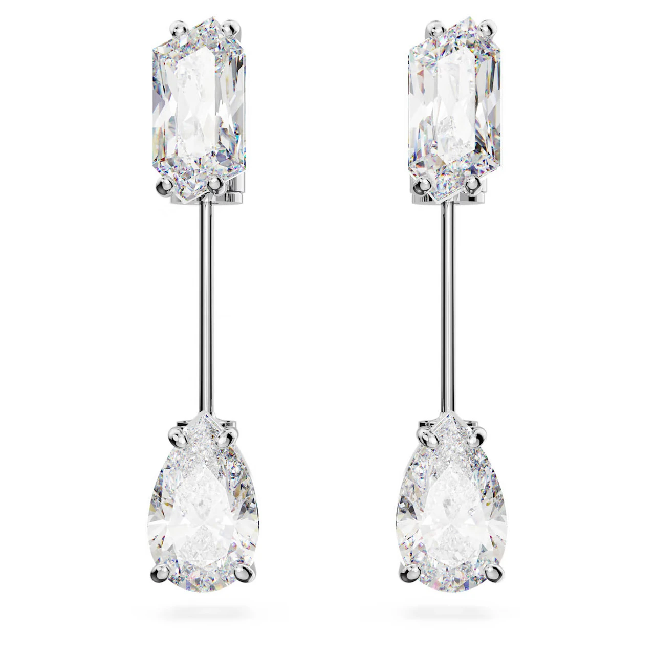 Elegance meets drama in these modern Mesmera earrings. Each piece features a rhodium plated bar with a prong-set Swarovski Zirconia at each end. These two stones are crafted with their own distinctive cuts, giving you a look that is instantly eye-catching. Enhance your own style or present these pierced earrings to a loved one as a wondrous gift.