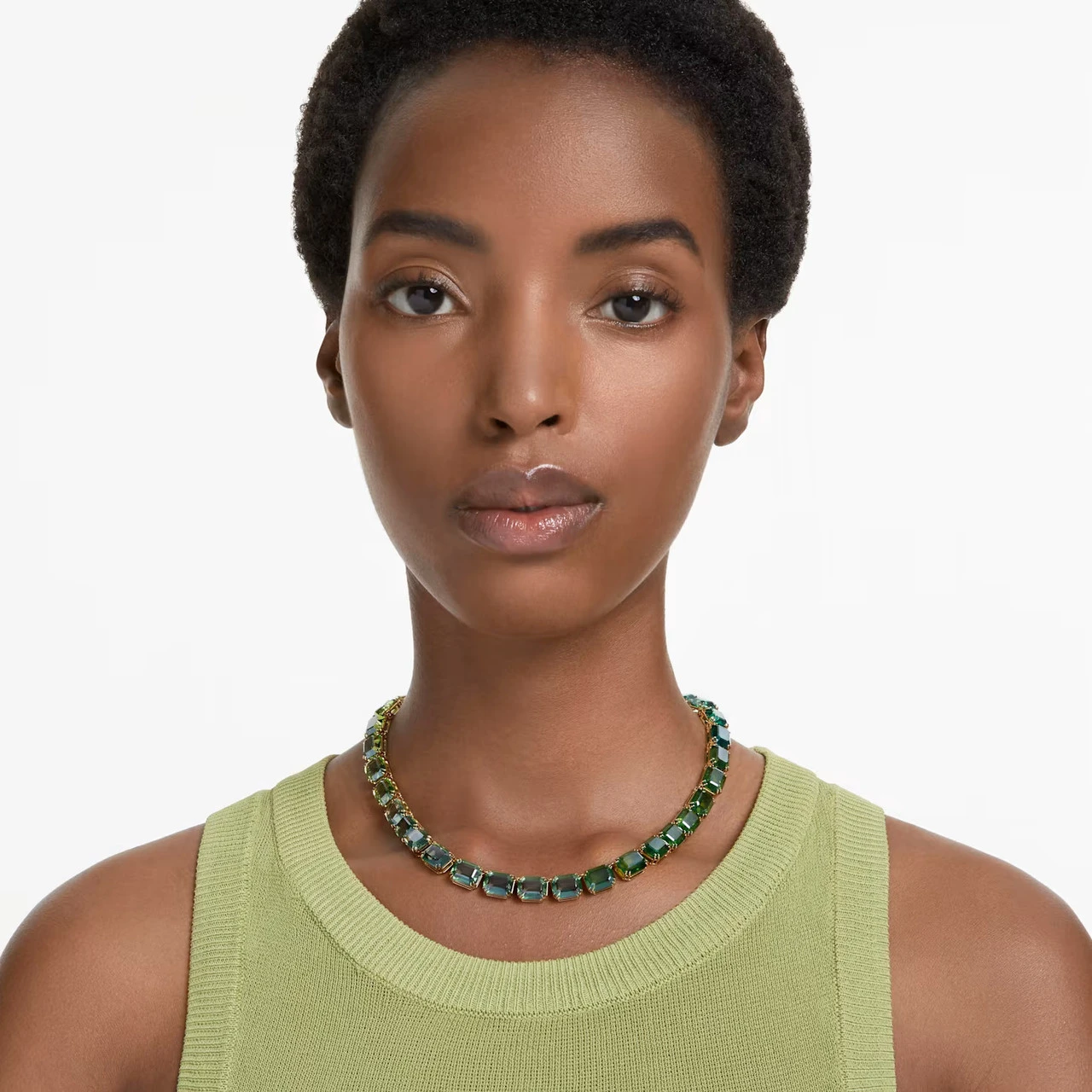 Choose eye-catching luxury with the rich hues of this Millenia necklace. The all-around gold-tone plated style is designed to catch the light, with a fully articulated row of octagonal crystals in multiple shades of green. Each stone displays the mastery of Swarovski’s double-prong setting and the piece is completed with a lobster closure. Treat yourself or a loved one.